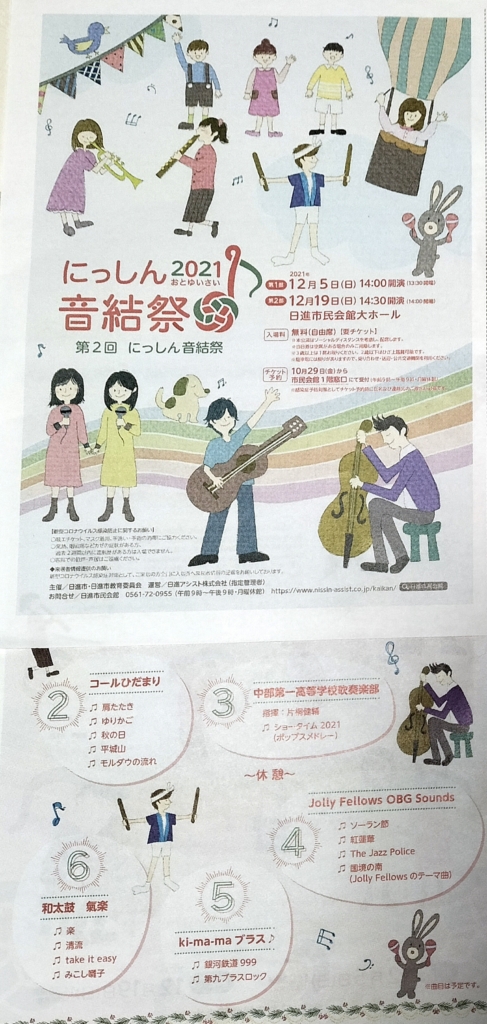 にっしん音結祭 2021 12/05 出演日誌 2021年12月5日 氣楽 1年ぶりの出演、盛り上がりました! にっしん音結祭のちらし、氣楽は6番目でした。 演奏直前写真 1曲目「楽(らく)」 2曲目「清流」 4曲目「みこし囃子」 出演日誌 よかったら、シェアしてね URLをコピーしました!