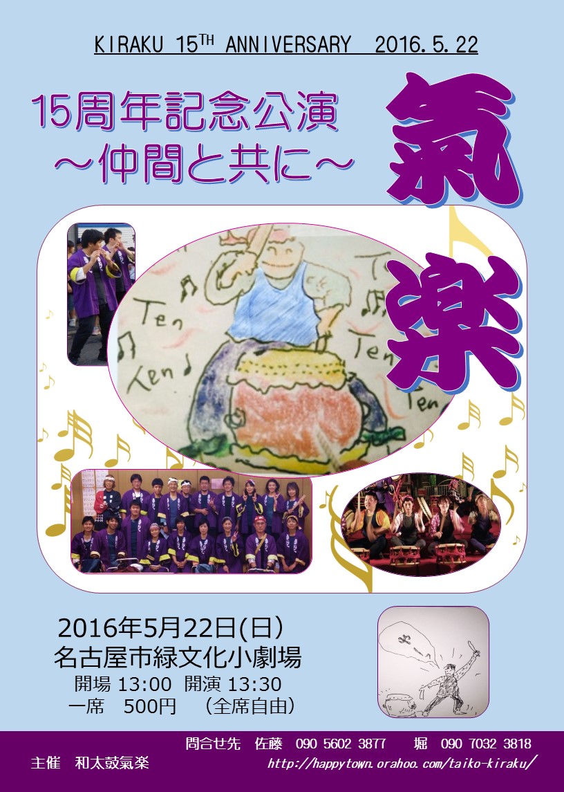 | 2002 | 4月 | 9名のメンバーで「氣楽」結成 練習場所は、天白生涯学習センター 。 「天白太鼓クラブ氣楽」から「氣楽」に命名。 初代代表:愛ちゃん |
